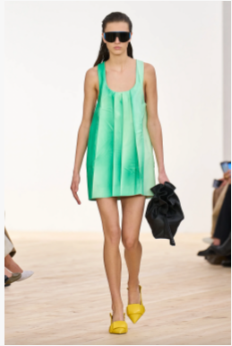 在Miu Miu 2026夏季系列中,解构主义围裙设计与鞋履共同构建起本季「劳作中的诗意」叙事主题。当或粗粝、或重工的围裙垂坠于闪光塔夫绸连衣裙及挺括西装之外,搭配着做旧的硬朗机车靴或Slingback皮鞋,或是与再生帆布渔夫凉鞋及复古球鞋形成呼应——这种对工作服元素的升华,恰好与鞋履设计中精致材质与实用主义的对话形成完美共振,完整诠释出Miuccia Prada笔下那个既天真又世故、在辛勤劳作与优雅幻梦间自如穿梭的现代女性形象。