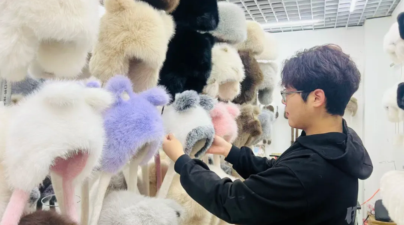 除了款式丰富多样的皮草服装,饰品区的备货工作同样火热。在安吉皮草的店铺内,各类皮草挂饰堆满货架,款式新颖别致。