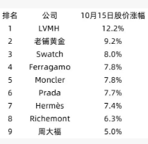 不止是 LVMH集团,大量奢侈品上市公司的股票都得到提振。10月15日,“华丽志奢侈品行业股票指数”所覆盖的27只奢侈品股票中,有25只实现上涨,仅有2只下跌。其中上涨幅度超过5%的就有9只(见下图),除LVMH外,还包括 Hermès(爱马仕)、Richemont(历峰集团)等奢侈品行业巨头。
