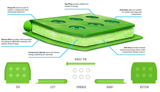 APL的核心技术“Load N' Launch”,本质上是一套植入鞋底前掌的八组弹簧装置。其设计原理是通过吸收运动员起跳前的下压力,储存能量并在起跳瞬间释放反冲力,以提供额外的弹跳助力。