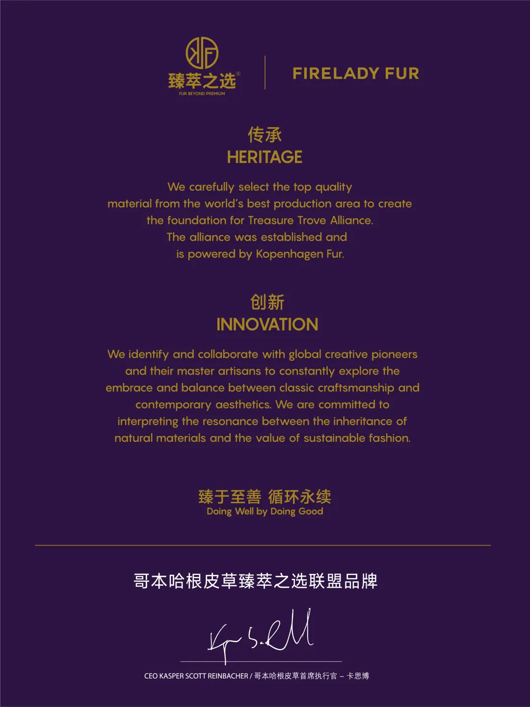 Kasper先生说道:“哥本哈根皮草是源自丹麦的天然皮草面料品牌,是全球领先的最具影响力的皮草资源平台。旗下“臻萃之选”天然皮草零售联盟,历经8年打磨的项目赋予了全新内涵,正如本次活动主题所传达的——一心一艺,方能铸就传奇。百年来我们凭借对品质的极致追求,已取得全球市场领先地位,未来也将继续携手臻萃之选合作伙伴,通过每一件皮草讲述独特故事,完整呈现天然原料的可持续性、特殊工艺匠心设计与贴心服务,让更多消费者放心感受皮草之美。”