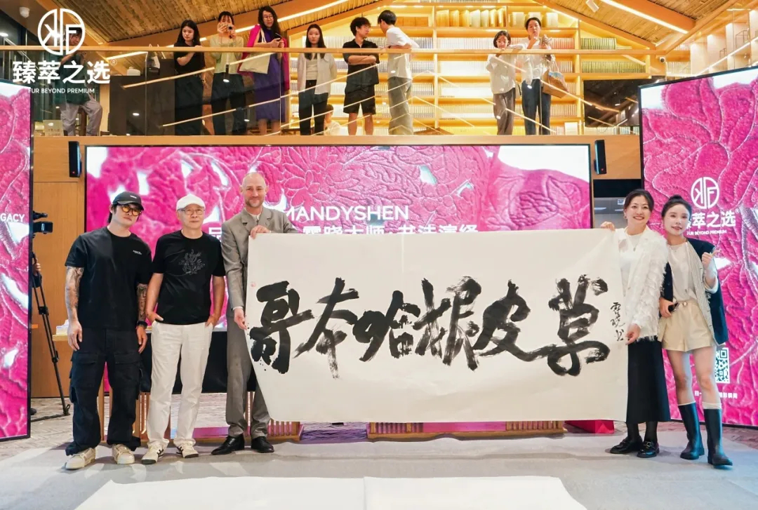 活动的尾声,由联盟品牌MANDYSHEN特邀我国当代著名书法家霍晓先生,带来一场东方美学与皮草工艺的跨界对话。这位来自成都、私家庄园“御翠草堂”的主人,不仅独创了字径仅2~5毫米、可在牙签上创作的“苔藓体”小楷,更秉持“始于自然,归于自然”的艺术理念,践行“以小楷的精神治园,以治园的精神写小楷”的人生观——这份对“匠心”的坚守,与哥本哈根皮草的百年理念不谋而合。霍晓先生现场挥毫,先是以精湛笔法写下“卓越、灵感、臻萃”,三个词既精准戳中MANDYSHEN的品牌内核,更与“臻萃之选”的联盟理念完美呼应;随后又题写“哥本哈根皮草”,以苍劲笔墨致敬品牌百年传承。