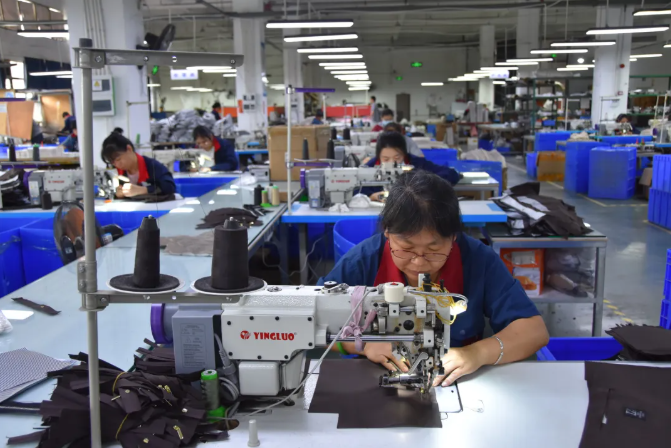 10月13日,位于自贡市荣县经开区的四川斯达特皮具制品有限公司生产车间内一派繁忙景象,机械运转声此起彼伏。9条专业生产线高效运转,工人们在各自岗位上熟练操作,一个个精致的手袋、钱包在生产线上快速流转。