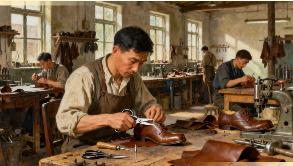 彼时的制鞋师傅靠着剪刀、锥子等简单工具,将皮革裁剪、拼接成鞋。