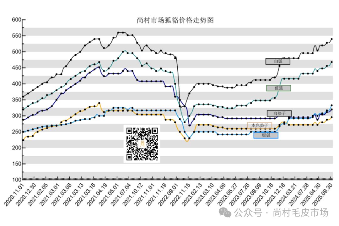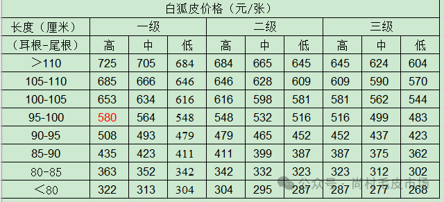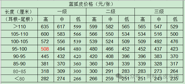 最近一段时间以来,狐貉皮的价格都上涨了,而且涨幅明显。蓝白狐皮从10月15日前后开始,尚村市场不但上的多,成的也多,价格逐渐上涨,价格上涨走走停停,近两日趋于平稳。截止到今日,蓝白狐价格上涨40-50元以上,质量好的甚至涨的还要多点,这样的上涨态势近几年内少见。价格表我们也做了相应的调整,蓝白狐上调了50元。目前蓝白狐处于新旧交替时期,价格会出现明显波动。我们这个公众号现在每月发一次,不能及时给大家提供信息,请大家密切关注当地市场动态。今天我们了解了一下诸城的蓝狐打皮情况,那边已经收尾。开始打皮是13元每斤,之后14,最后15-16元每斤(诸城经纪人电话13964697159)。