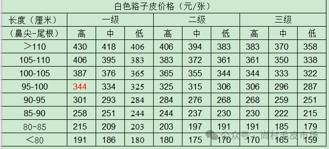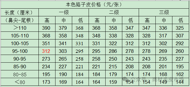 生皮价格表价格表说明:1、市场上的皮张交易多为混皮形式,很少按照上述分级进行,所以上面价格只供参考。2、表中价格只是说明在尚村能够卖到的大概价格,如果质量更好的,价格有可能高于表中价格,具体价格请参照当地交易价格。3、长度单位为厘米,貉子从鼻尖-尾根,狐狸从耳根-尾根。