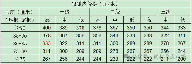 貉子皮价格也涨了20-30元,本色貉子皮价格价格表上调了20元,白色上调30元。现在尚村,昌黎、大营貉子皮销售都处于旺季。银狐皮表现不佳,和上月相比基本持平,价格表未做变动。