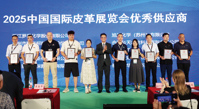 四川达威科技股份有限公司、宝斯卡(商丘)化工有限公司、兄弟科技股份有限公司、广州市泉风化工科技有限公司、淄博沂化新材料有限公司、山东皓尊生物科技有限公司、浙江盛汇化工有限公司、浙江和平新材料股份有限公司、淄博环亚助剂科技有限公司、山东泰茂化工科技有限公司10家企业荣获“皮革化工类优秀供应商”。