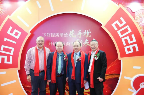 岁序更迭,华章日新。近日,东方宾馆高朋满座、暖意融融,近千名政府、商协会领导,商圈专业市场高层、企业精英及行业知名人士齐聚一堂,共赴由广州越秀区矿泉商会主办的“下好提质增效先手棋 开创矿泉商圈新未来”矿泉地区高质量发展大会、矿泉商会十周年庆典、第三届就职典礼暨2026年迎春晚会。这场荣誉与喜悦交织、交流与赋能并行的高规格盛宴,不仅见证了矿泉商圈十年发展的辉煌成就,更镌刻下新濠畔集团深耕产业、赋能商户、引领升级的责任与担当。