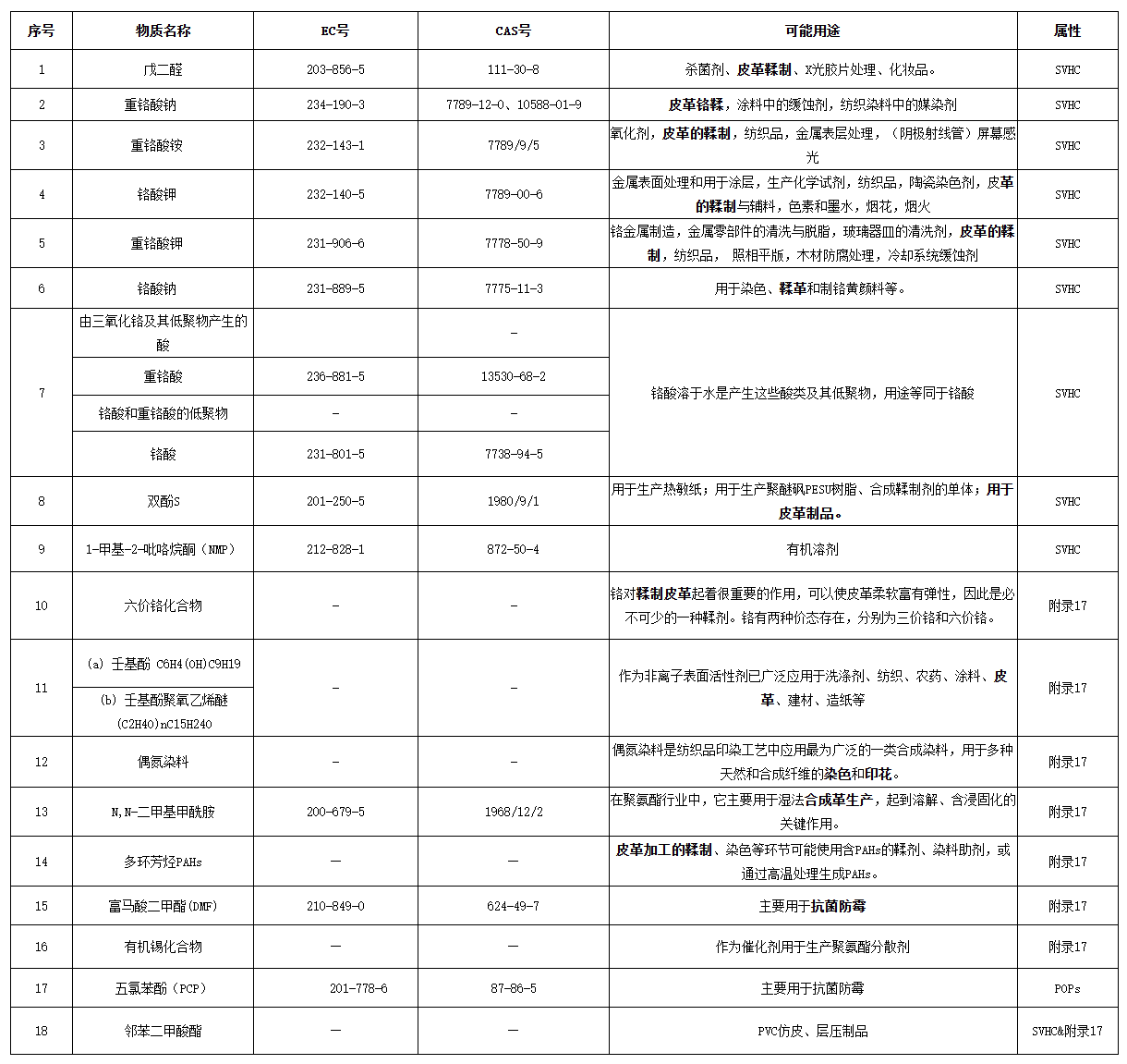 皮革化工材料是制革、制裘专用的化工材料,对制革、制裘起着十分重要的作用,它分有原料皮处理材料、鞣制材料、染料、润滑加脂材料、涂饰材料、功能整饰材料和毛皮材料七个大类,皮革化工材料部分属于欧盟REACH法规管控物质清单: