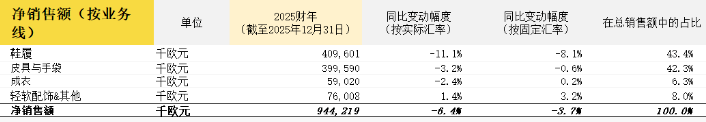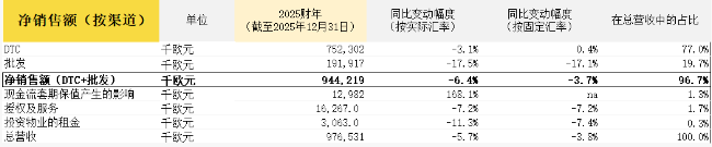 其中,第四季度综合营收同比下降3.2%至2.82亿欧元(按固定汇率计-2%)。第四季度DTC(直接面向消费者)渠道营收按固定汇率计算增长6.3%,较2025年第三季度增速加快,而批发渠道营收有所下滑。