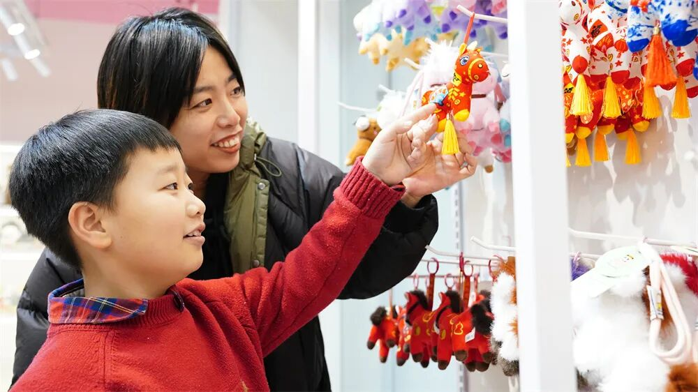 1月30日,白沟新城毛绒玩具BGT产业园一家毛绒玩具店内,顾客带孩子选购马元素挂件。孙浩龙摄1月30日,白沟新城毛绒玩具BGT产业园一家毛绒玩具店内,顾客带孩子选购马元素挂件。孙浩龙摄