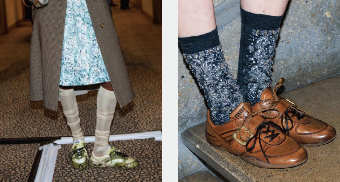 今年秋冬Miu Miu继续呈现更多奢华时装风格的薄底运动鞋,从运用复古焦糖色皮革打造的巴恩风薄底鞋,以及选用蛇纹图样的拼色款,都将成为助力品牌在今年业绩继续飙涨的得力干将。