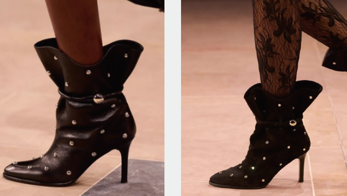 Isabel Marant总是以夜色巴黎应该具有的气质呈现,从异域皮革纹样到堆叠的欧根纱,不废吹灰之力营造出法式松弛时髦感,而鞋履方面同样出彩,装饰有金属钉珠的细跟踝靴,巧妙勾勒出腿部线条,在日装与派对晚装间游走自如。
