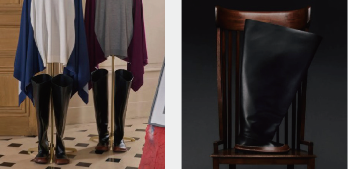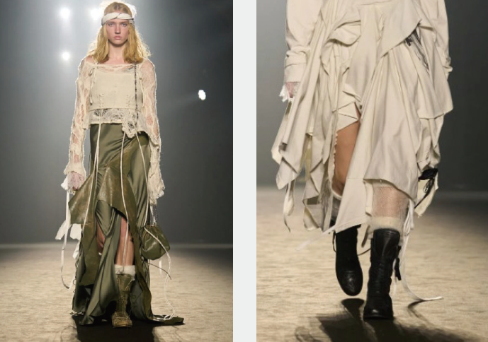 Ann Demeulemeester 2025秋冬系列的拳击靴作业最为出众,从其明星单品高筒绑带军靴延展而来的拳击靴,带有品牌一贯冷峻又诗意的美学,搭配文艺飘逸的女性色彩时装,可起到十分曼妙的化学效应。
