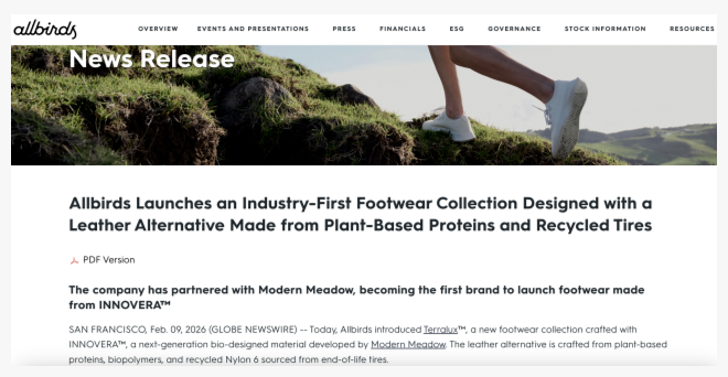 2026年2月9日,Allbirds推出全新 Terralux™鞋履系列,成为行业首个采用 INNOVERA™生物基皮革替代材料的品牌,该材料由Allbirds与Modern Meadow合作研发,以植物蛋白、生物聚合物和回收轮胎提取的再生尼龙 6 制成,无动物成分且可再生碳含量超 80%,质感和使用特性与传统皮革一致。本次系列共三款鞋型,含男女款Cruiser Terralux™及男士专属 Varsity、Runner NZ Terralux™,定价 135-145 美元,各有三种配色,兼顾设计感与日常穿着舒适度。INNOVERA™此前多用于汽车内饰、箱包等领域,此次首次应用于鞋履,该系列现已登陆 Allbirds 官网发售。
