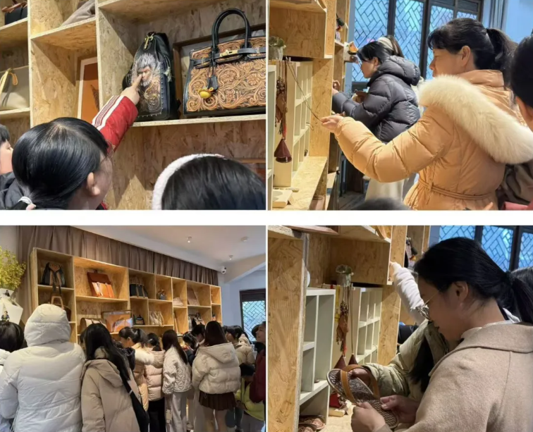 课程伊始,老师带领全体参与者走进皮具制作工作室,近距离观赏各类精致的皮具成品与制作工具。古朴的皮质材料、精巧的手工缝线、充满岁月感的匠作器具,让大家沉浸式感受客家皮具非遗技艺的深厚底蕴与艺术美感。