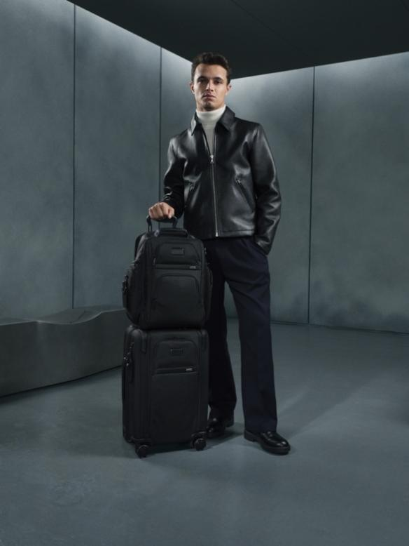 TUMI途明全球品牌大使Lando Norris演绎TUMI Alpha系列 黑色TUMI Brief Pack商务双肩包与黑色双重拉链开合可扩展登机箱
