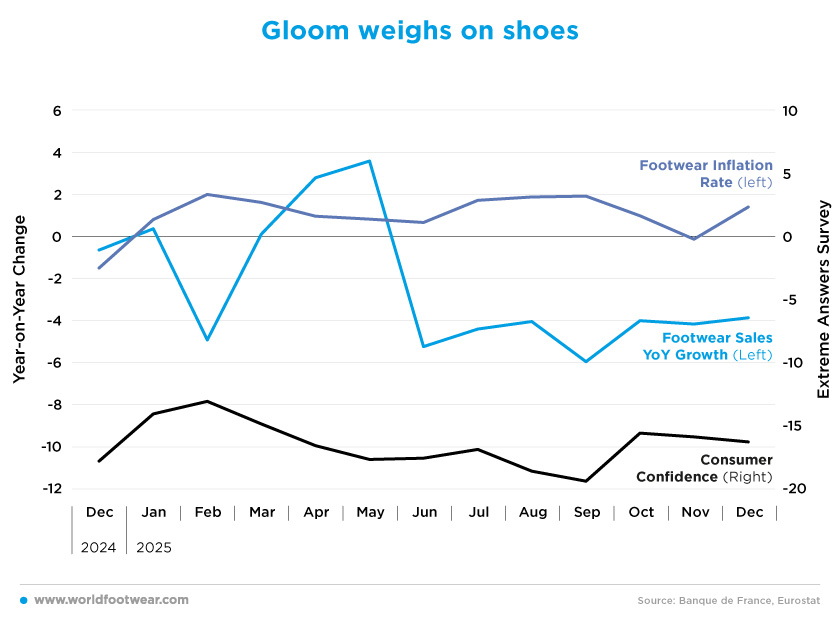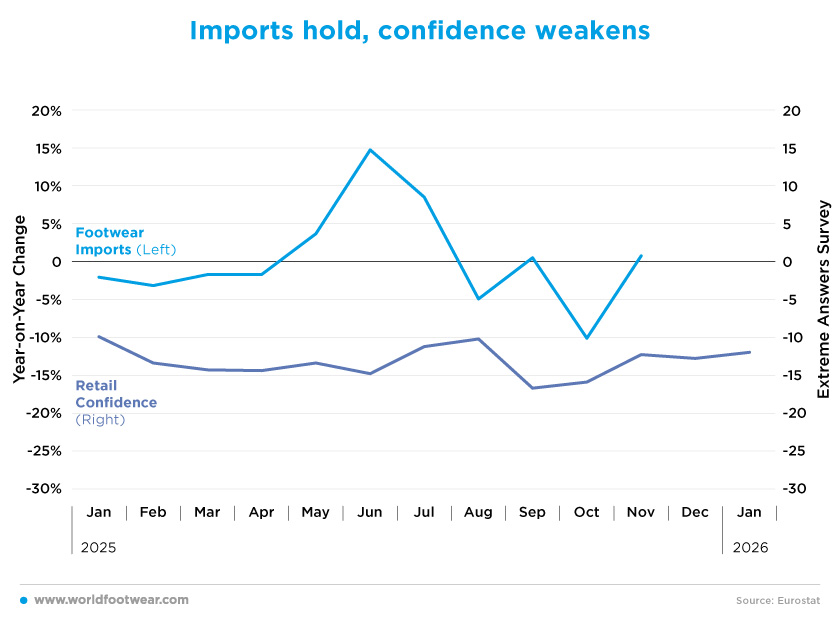 The French retail sector remained largely stagnant in 2025. Subdued sales, declining consumer confidence and cautious household spending negatively impacted footfall and average basket sizes in physical stores. While e-commerce continued to grow, the footwear sector experienced falling sales, negative sentiment and limited inflationary support. Data on imports also suggests that retailers have adopted more cautious inventory management strategies. Even the approval of the new Budget does not appear to lift the cloud of uncertainty hanging over the year ahead.