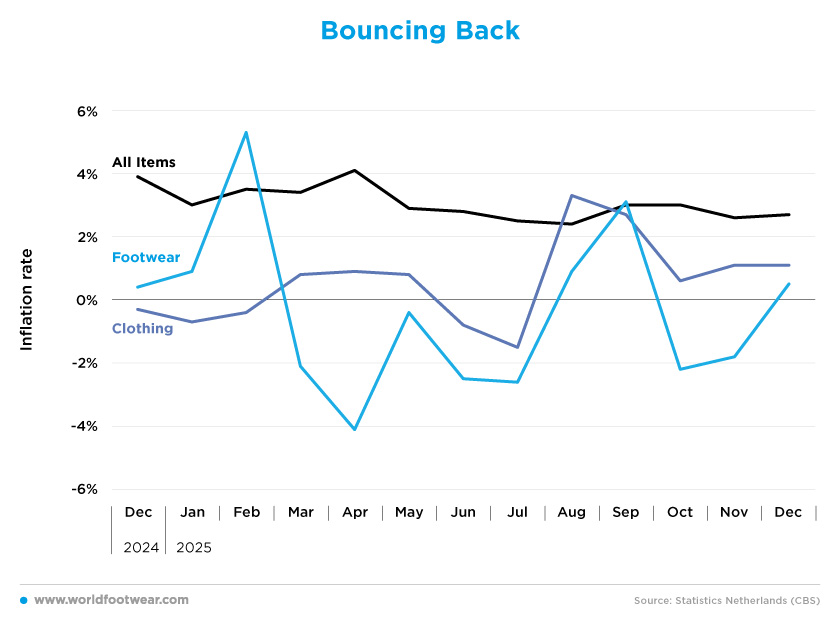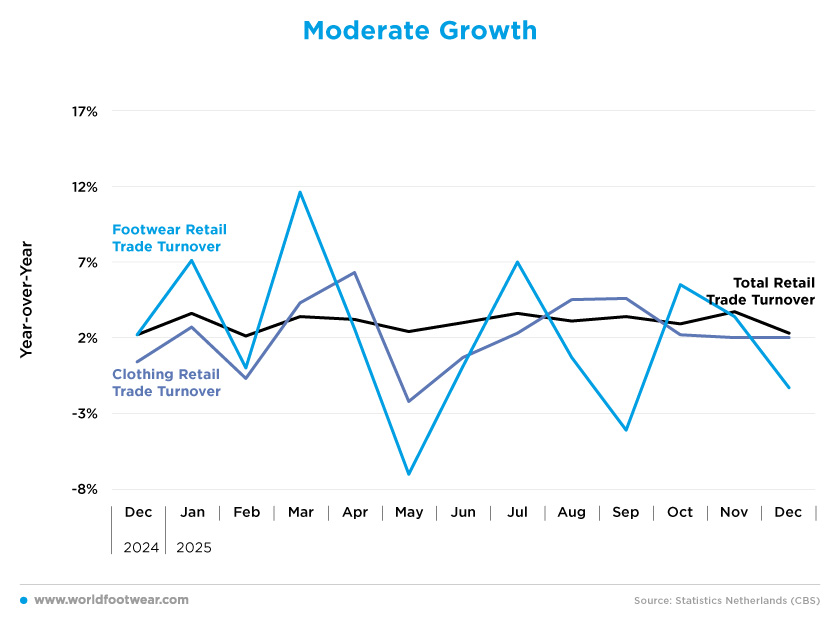 The retail sector in the Netherlands remained resilient in 2025, achieving moderate growth. However, the fashion retail sector, including the footwear sub-sector, was more volatile. While overall inflation eased, clothing and footwear saw subdued or negative price dynamics, potentially suggesting limited pricing power. Despite relatively stable retail sentiment, consumer confidence deteriorated towards the end of the year, which, together with a slowdown in footwear imports, points to a softer trade outlook.