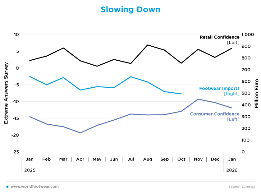 Overall, the outlook for 2026 remains uncertain. Consumer confidence improved during most of 2025 but weakened again at the turn of the year, while retail confidence remained positive, highlighting a contrast between household sentiment and business expectations. At the same time, although footwear import growth has followed a downward trend, the absence of data for November, December, and January means that recent developments may still alter the overall picture.