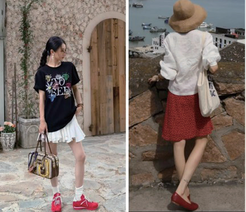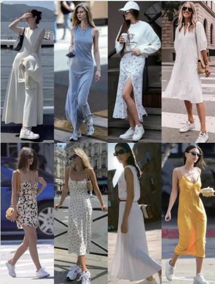 “裙子+球鞋”简直是 夏日里的一股清流,把裙子 的柔美和球鞋的休闲完美结 合,妥妥的清新文艺风。比 如帆布鞋、小白鞋,老爹鞋 等,搭配裙子非常适合日常 出行、逛街、约会等场合。
