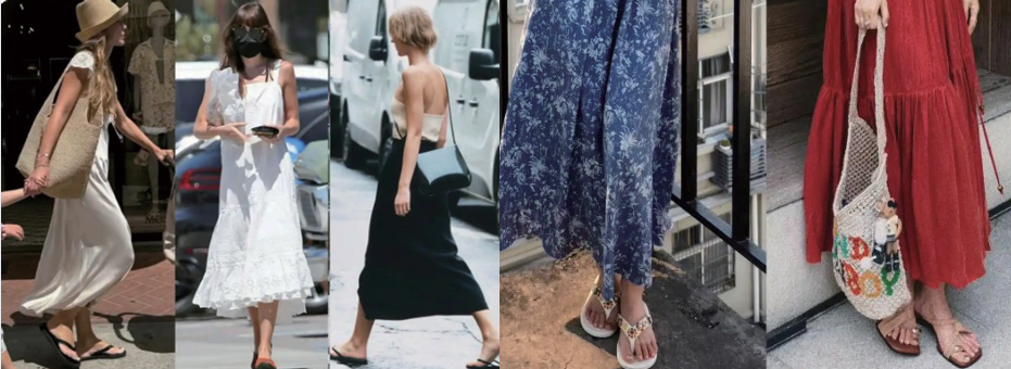 平底凉拖绝对是夏季的“懒人福音”,它和裙子 的搭配能营造出一种慵懒松弛的感觉,非常适合在海 边度假和日常休闲逛街。