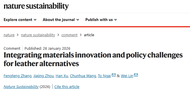 2026年1月26日,皮革科学与工程杂志社社长,四川大学林炜教授与香港中文大学魏涛(To Ngai)教授合作,对生物基皮革替代品(类皮革材料)面临的挑战和机遇进行了评述,相关论文以Integrating Materials Innovation and Policy Challenges for Leather Alternatives为题,发表于Nature Sustainability。文章系统介绍了生物基皮革替代品的材料组成及制备方法,深入分析了这类新型材料在产品性能和制造方面所面临的问题。文章最后探讨了生物基皮革替代品在开发和应用中的挑战,指出了潜在的研究方向,旨在为创新材料的研发提供参考。