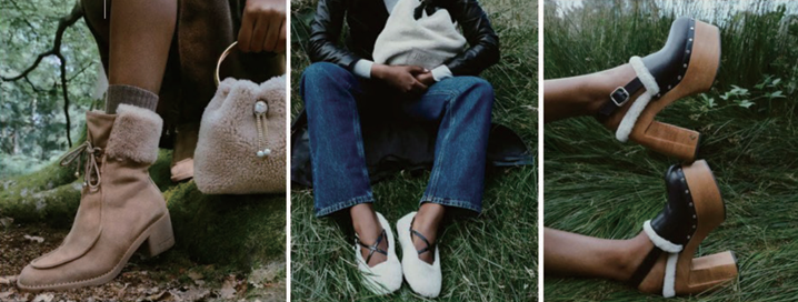 本季重点款式:ALIDA露跟高跟鞋,这款大胆重 塑木屐的玩趣之作于2025年夏季首次亮相,在本季 则以厚底防水台、高光小牛皮材质及羊毛革镶边焕新打造,在保暖与造型之间取得平衡;ELERI芭蕾平底 鞋,以羊毛革覆盖鞋面,赋予永恒款式以新颖表达; HALI及踝靴,采用绒面麂皮革制作,搭配羊毛革鞋 领和钩扣系带;TAMIA短靴与TASMIN及膝靴,则 用精美的缆绳粗针纹理重新诠释切尔西靴型。