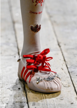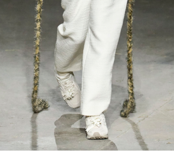 Simone Rocha与Adidas的首度联名无疑是本季最受瞩目的鞋履事件之一。这位以浪漫繁复风格著称的设计师,将其标志性的芭蕾美学注入运动鞋廓形,创造出芭蕾舞鞋与运动鞋的混合体。"十几岁时,我曾在复古芭蕾舞裙下穿着Adidas跑步短裤。这个品牌一直是我生活的一部分,"Simone Rocha表示。更值得关注的是,她获得了"重新设计logo"的创作自由——这在Adidas的联名历史中并不常见。除芭蕾运动鞋混血款外,黑白布洛克鞋、绒毛拖鞋与大量搭扣元素的运用,共同构成了Simone Rocha首度涉足运动鞋领域的完整叙事。
