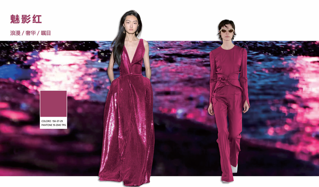 2月,马年新春的奔腾气场与情人节的柔媚韵律在此交汇,魅 影红正是这场双程叙事的色彩锚点。它的色相落于红紫交融的区间, 红承中式传统 “岁朝新禧” 的喜庆底色,春宴上的亮片礼服裙摆摇 曳时,恰是马年 “踏春启新” 的鲜活意象;紫渗现代时尚的神秘质感, 通勤连体裤既有职业气场,又藏情人节约会的暧昧张力。明度中低 的深邃,让毛绒大衣裹着冬末余温;纯度中高的浓郁,让丝绒包袋、 浆果唇妆成了造型的 “点睛暗号”。从高定秀场的压轴裙装,到街巷 的日常穿搭,魅影红是文化与时尚的织线 —— 以传统红锚定岁时 情绪,以先锋紫注解当代审美,每一次上身,都是 “东方意象 × 现 代时尚” 的双向奔赴。