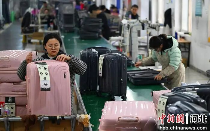 中新网河北新闻3月2日电(徐巧明 冯云) 2月28日,走进河北省保定市白沟新城某箱包皮具有限公司车间看到,各环节流水线高效运转,工人们熟练操作着设备,赶制箱包订单。