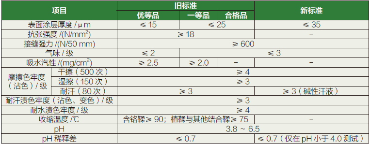 由表2可知,新标准进一步放宽了表面涂层厚度要求,目的是尽可能保留皮革的天然特性,避免过度修饰。新标准明确了耐汗渍色牢度的种类为碱性汗液,更贴近实际使用环境。新标准明确了pH稀释差的测试条件规定,仅pH<4时测试,可显著减少冗余测试,进而降低企业检测成本。此外,新标准删除了抗张强度、吸水汽性、收缩温度这三项要求,更加符合产品实际使用需求,也减少了冗余测试。由表3可知,新标准新增了六价铬、挥发性有机物、含氯苯酚等与人体健康直接相关的化学安全指标,进一步强化了健康风险管控,在源头杜绝了化学有害物超标。