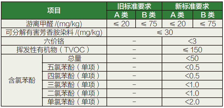 新标准在删除了抗张强度、吸水汽性、收缩温度要求的同时,新增了六价铬、挥发性有机物、含氯苯酚等有害物质化学安全指标,详见表2和表3。