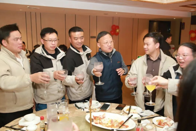 当晚,公司精心筹备的开工宴在欢声笑语中温情开席。宴席期间,总经理徐家宽来到员工中间,与大家举杯共饮,互致祝福。觥筹交错间,员工们纷纷向徐总敬酒,感谢公司提供的广阔平台与关怀,徐家宽也欣然回应,对大家展现出的昂扬斗志表示欣慰。