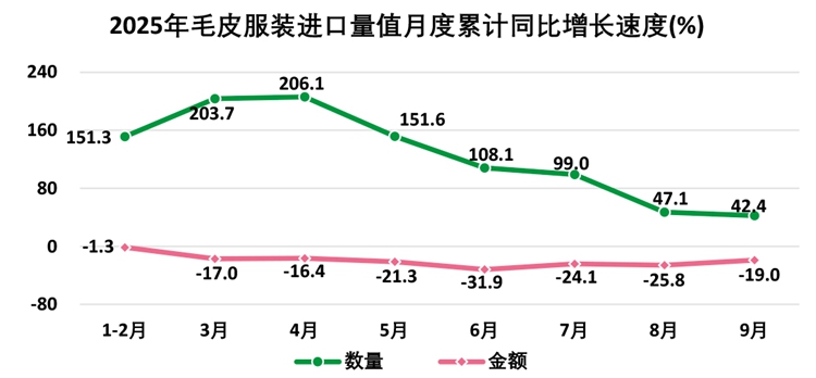 1—9月,全国出口毛皮服装54.7万件,出口额1.3亿美元;进口毛皮服装2.1万件,进口额3,204.0万美元(进口单价1,514.3美元/件,同比下降43.1%)。