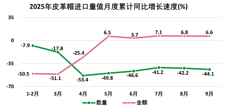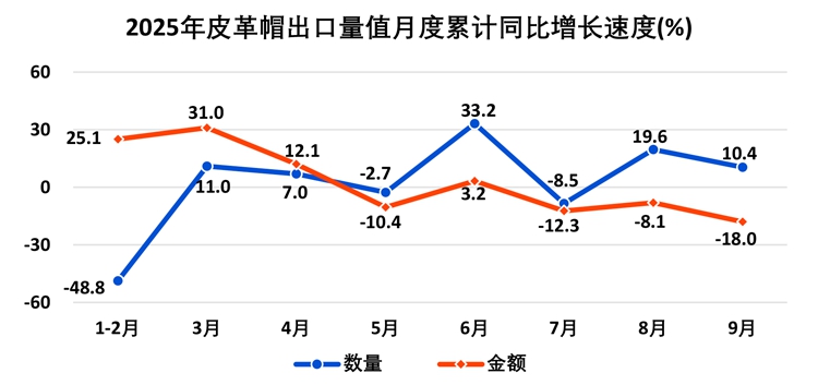 1—9月,全国出口皮革帽26.8万顶,出口额127.4万美元;进口皮革帽4322顶,进口额53.4万美元(进口单价123.5美元/顶,同比增长90.5%)。
