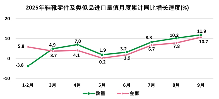1—9月,全国出口靴鞋零件及类似品39.4万吨,出口额34.2亿美元;进口靴鞋零件及类似品6,692.2吨,进口额2.0亿美元。