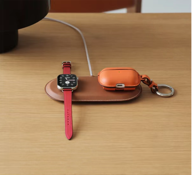 该产品整体由爱马仕标志性的“金色Swift小牛皮”精心包裹,触感细腻且极具辨识度,可以同时给iPhone和Apple Watch充电。