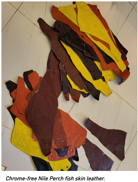 Fish skin tannery Alisam Products Developments & Design, which uses skins from the invasive Nile Perch, is offering leather which owner Newton Owino describes as “non-conventionally tanned, chrome-free, naturally dyed, minimum 1 sq. ft. each, suitable for leather goods, footwear and textile blend”.