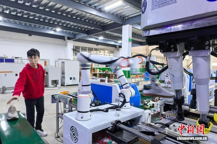 24日,中新网记者深入晋江产业一线,实地探访企业智能化转型成果,近距离感受“中国鞋都”的产业活力。福建中泰德玛智能设备有限公司总经理赫赤接受采访时表示,从人工到智能,从单机换人到全链换线,越来越多晋江鞋企为传统产业装上了数字引擎。