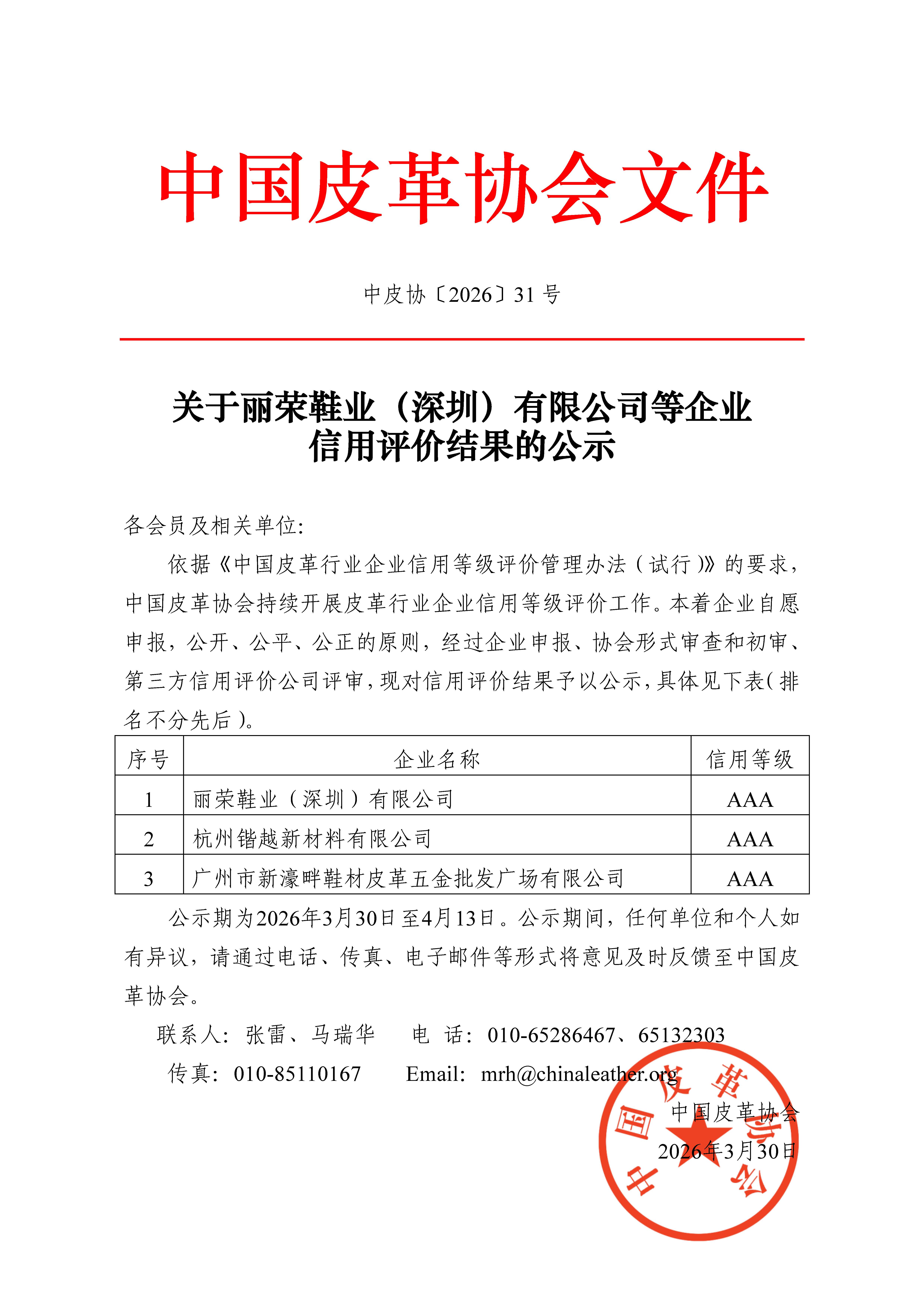 关于丽荣鞋业(深圳)有限公司等企业信用评价结果的公示