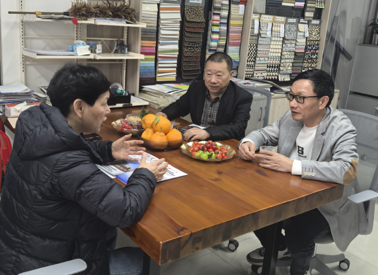最后一站,俞万丰秘书长来到义乌大大箱包材料有限公司。该公司是义乌皮革行业龙头企业,主营PU、PVC人造革、无纺布、牛津革等箱包材料,产品远销欧美、东南亚等地区,具有较强的市场影响力。座谈中,双方围绕箱包材料环保化、轻量化趋势,以及宁波企业对高端、特色面料的需求进行交流,并一致认为两地皮革箱包企业有较高的契合度,应持续加强交流合作。