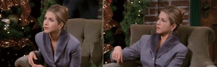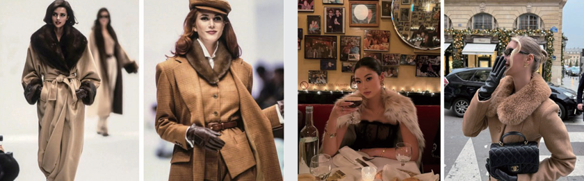 天然皮草,是“千金感”最直观,也最考验分 寸感的视觉符号。然而,如果将天然皮草毫无节制地覆盖全身, 则极易失去精致度和设计感。而经典品牌设计出的 古早千金感则深谙此道,“以少胜多,以点缀替代包 裹”。如《老友记》中瑞秋的造型所示,一件基础款 的呢子大衣,因领口一圈精巧的皮草饰边而瞬间焕 发光彩。