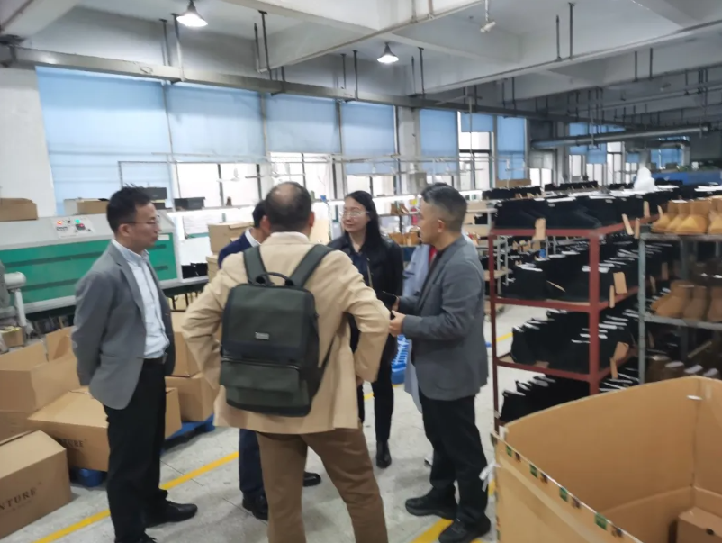 下午,考察团一行实地走访了高桥裘皮鞋业行业商会会长单位——镇江德倪鞋业有限公司,以及副会长单位——镇江旺达鞋业有限公司。在企业生产车间和产品展示厅,考察团详细了解了生产工艺、质量控制、设计研发及市场销售情况,对企业在智能化改造、自主品牌建设等方面取得的成效给予充分肯定。