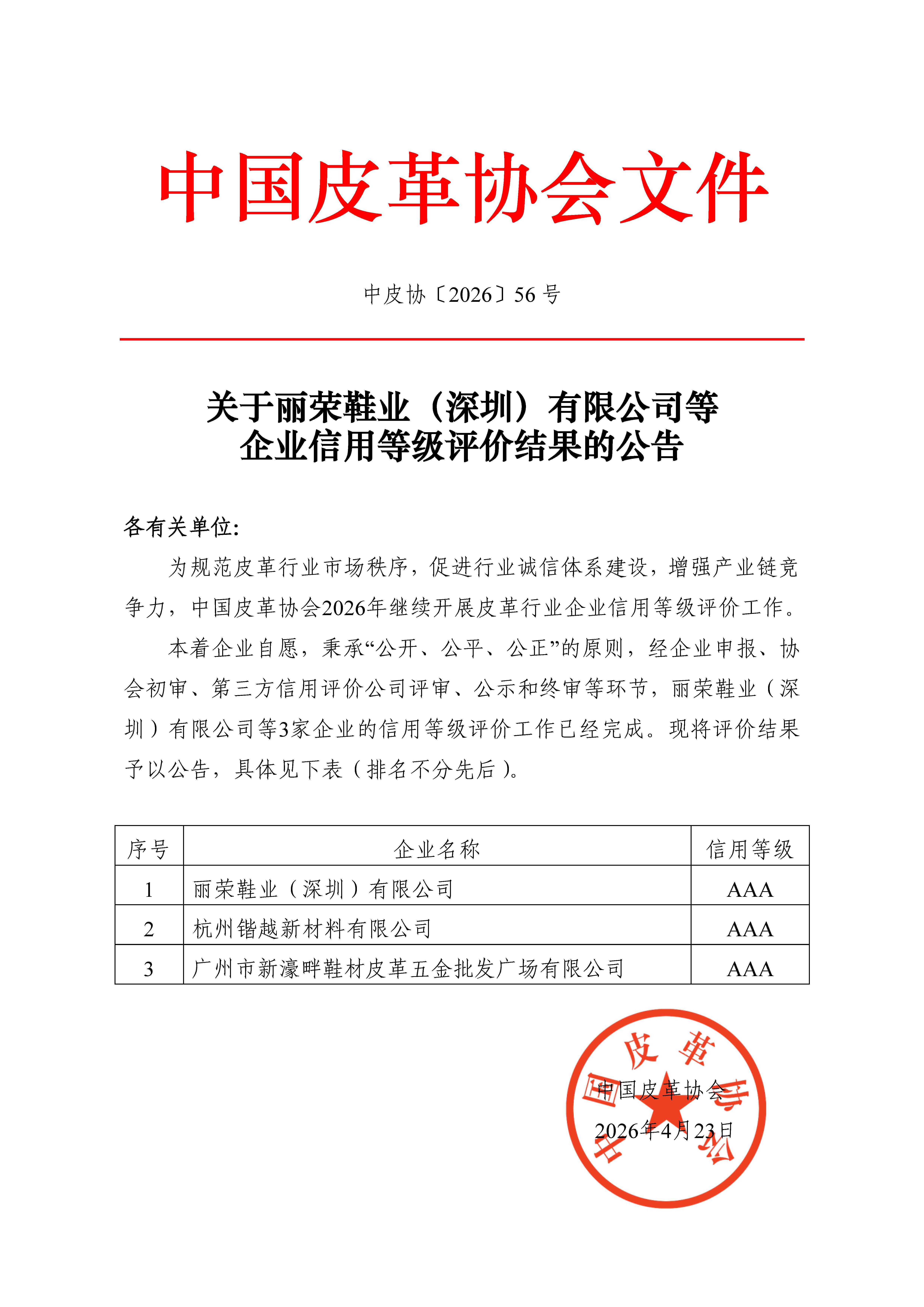 关于丽荣鞋业(深圳)有限公司等企业信用等级评价结果的公告