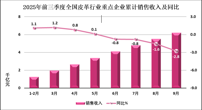 中国皮革协会掌握数据显示,2025年前三季度,我国皮革行业重点企业完成销售收入6200多亿元,同比下降2.8%。从细分行业重点企业销售收入看,制革重点企业完成销售收入近410亿元,同比下降4.7;制鞋重点企业完成销售收入3980亿元,同比下降1.3%;箱包重点企业完成销售收入770亿元,同比下降10.7%;皮革服装重点企业完成销售收入53亿元,同比增长8.2%;毛皮及制品重点企业完成销售收入95亿元,同比下降10.3%。