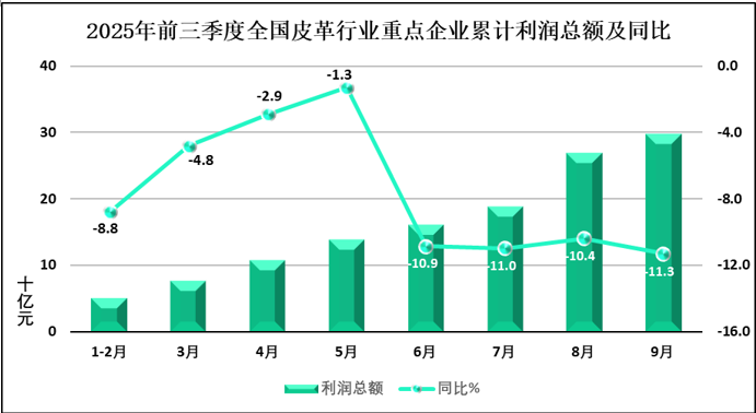 2025年前三季度,全国皮革行业重点企业利润总额近300亿元,同比下降11.3%;主营业务利润率为4.78%,同比下降0.46个百分点。从细分行业重点企业利润来看,制革重点企业利润总额12亿元,同比下降6.3%,利润率为2.83%,同比下降0.05个百分点;制鞋重点企业利润总额近240亿元,同比下降8.5%,利润率为5.96%,较上年同期下降0.47个百分点;箱包重点企业利润总额20亿元,同比下降28.8%,利润率为2.64%,较上年同期下降0.67个百分点;皮革服装重点企业利润总额1.4亿元,同比增长35.1%,利润率为2.76%,较上年同期提高0.55个百分点;毛皮及制品重点企业利润总额3亿元,同比下降8.3%,利润率为3.23%,较上年同期提高0.07个百分点。