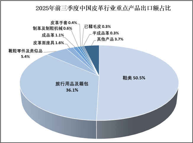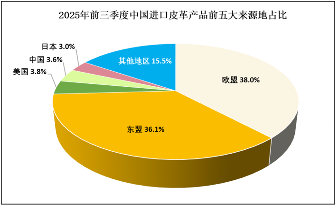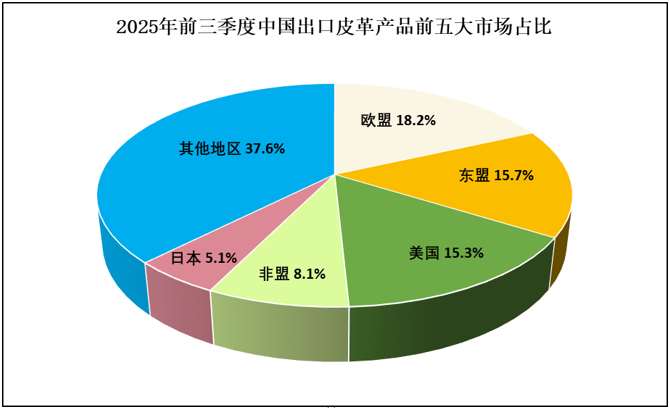 2025年前三季度,中国皮革行业出口前五大目标市场欧盟、东盟、美国、非盟、和日本的出口额合计占皮革行业出口总额的62.4%,较上年同期下降0.7个百分点。