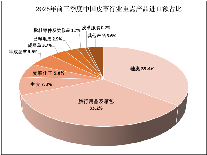 原材料进口方面,2025年前三季度,中国进口生皮106.0万吨、8.4亿美元,同比分别下降5.1%和17.2%;进口半成品革43.8万吨、6.5亿美元,同比分别下降5.0%和16.1%;进口成品革2.8万吨、4.3亿美元,同比分别下降15.7%和16.9%。